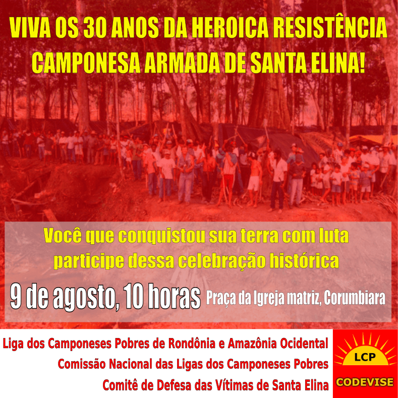 Luta camponesa 30 anos da Batalha de Santa Elina são honrados com vigorosa manifestação em Corumbiara Resistência Camponesa13 ago, 2025 Luta camponesa Nota LCP: PM “guaxeba” de Rondônia assassina mais um camponês Resistência Camponesa9 ago, 202510 ago, 2025 Luta camponesa Dias antes de assassinato de camponês em Rondônia, governo federal fez demagogia com ‘proteção a camponeses de Santa Elina’ Resistência Camponesa8 ago, 202517 ago, 2025 Luta camponesa Lula não cumpre promessa feita aos camponeses de Corumbiara há 30 anos Resistência Camponesa7 ago, 20257 ago, 2025 Luta camponesa Viva os 30 anos da Heroica Resistência Camponesa de Santa Elina Resistência Camponesa6 ago, 20257 ago, 2025 Luta camponesa Dezenas de organizações se somam à manifestação do dia 09. Veja programação completa. Resistência Camponesa5 ago, 20255 ago, 2025 Luta camponesa Participe da manifestação pelos 30 anos da Heroica Resistência Armada de Santa Elina Resistência Camponesa3 ago, 20253 ago, 2025 Luta camponesa PE: Camponeses ocupam terras e sede do Incra em Pernambuco em denúncia à política agrária do governo Resistência Camponesa30 jul, 202530 jul, 2025 123